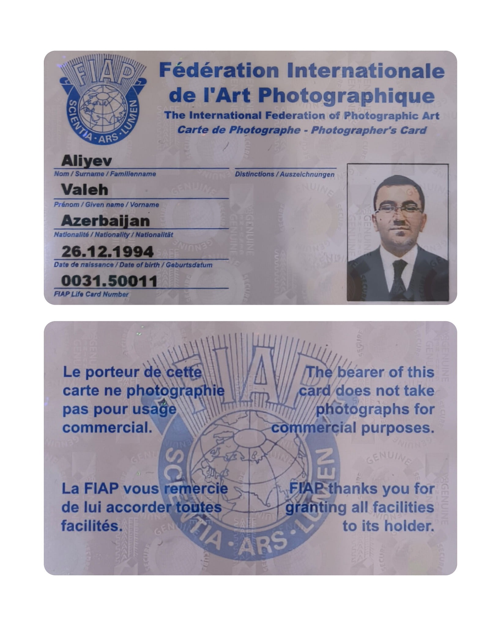 Azərbaycanlı gənc fotoqraf Valeh Arifoğlu dünya üzrə nüfuzlu fotoqrafiya təşkilatı olan Beynəlxalq Foto Sənəti Federasiyasının (FIAP) rəsmi üzvlüyünə qəbul edilib.