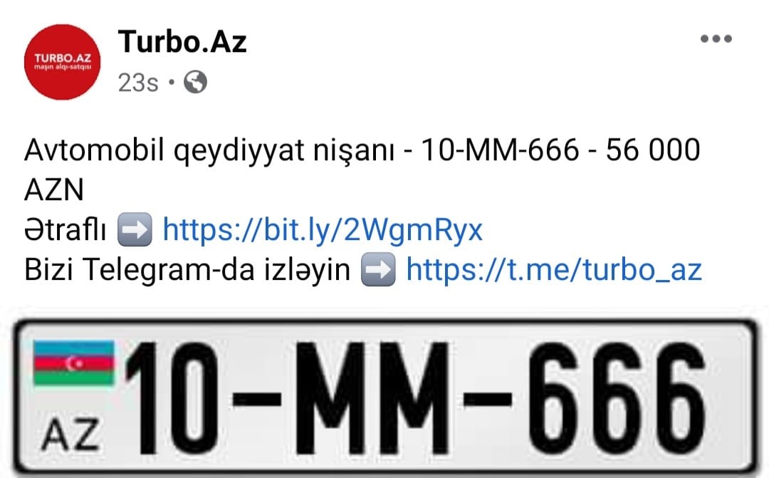 22 avqust tarixində yerləşdirilən elanda "10-MM-666” nömrəli avtomobil qeydiyyat nişanı 56 min manata təklif olunub.///sfera.az