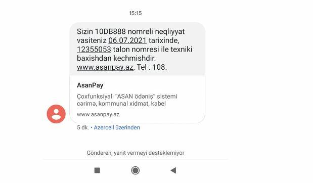 Bakıda avtomobili olmayan şəxsə texniki baxışdan keçməsinə dair “AsanPay”dan bildiriş gəlib.