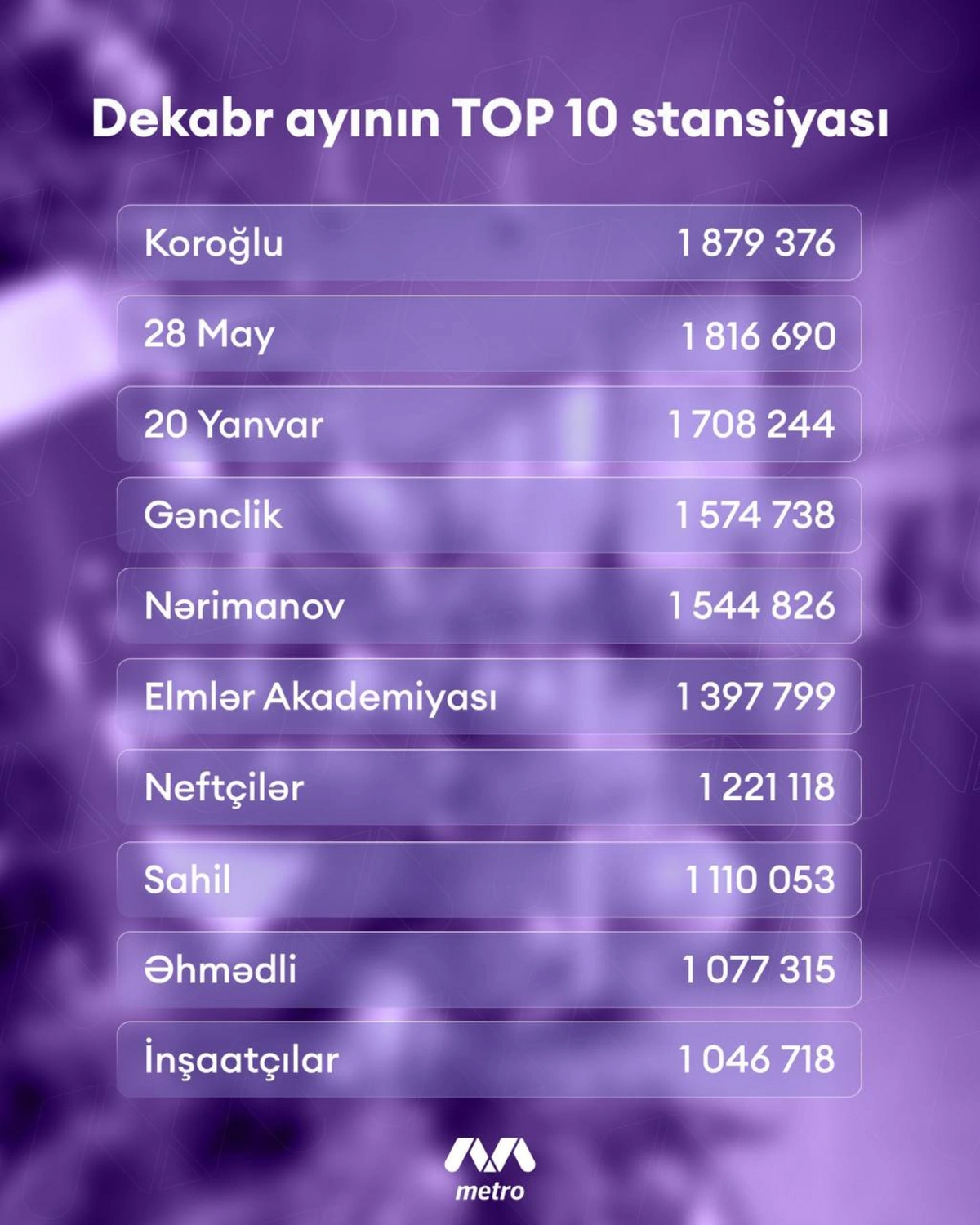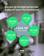 Bayram günlərində Bakı Metropoliteni 2 milyona yaxın sərnişin daşıyıb. Bu barədə Avtosfer.az-a "Bakı Metropoliteni" QSC-dən bildirilib. 2025-ci ilin dekabrında isə 2024-cü ilin eyni dövrü ilə müqayisədə 2,2 % artım müşahidə olunub.