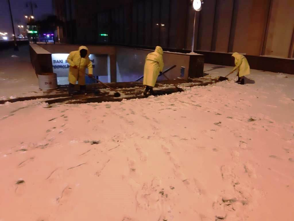 Bakı Şəhər İcra HakimiyyətindənAvtosfer.az-a verilən xəbərə görə, səhərə kimi xidmətlər yağan qarın küçə, prospekt və piyada səkilərindən, avtobus dayanacaqları və metro stansiyalarının qarşısından təmizlənməsini aparıblar.
