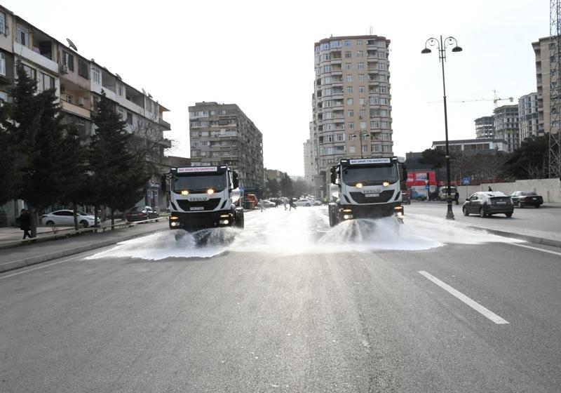 Səhər saatlarından Bakı Şəhər İcra Hakimiyyətinin kommunal təsərrüfat xidmətlərinin texnikası tərəfindən şəhərin 370 əsas küçə və prospektlərinin yuyucu maddələrlə yuyulması təmin edilib, eyni zamanda genişmiqyaslı təmizlik və abadlıq işləri həyata keçirilib.