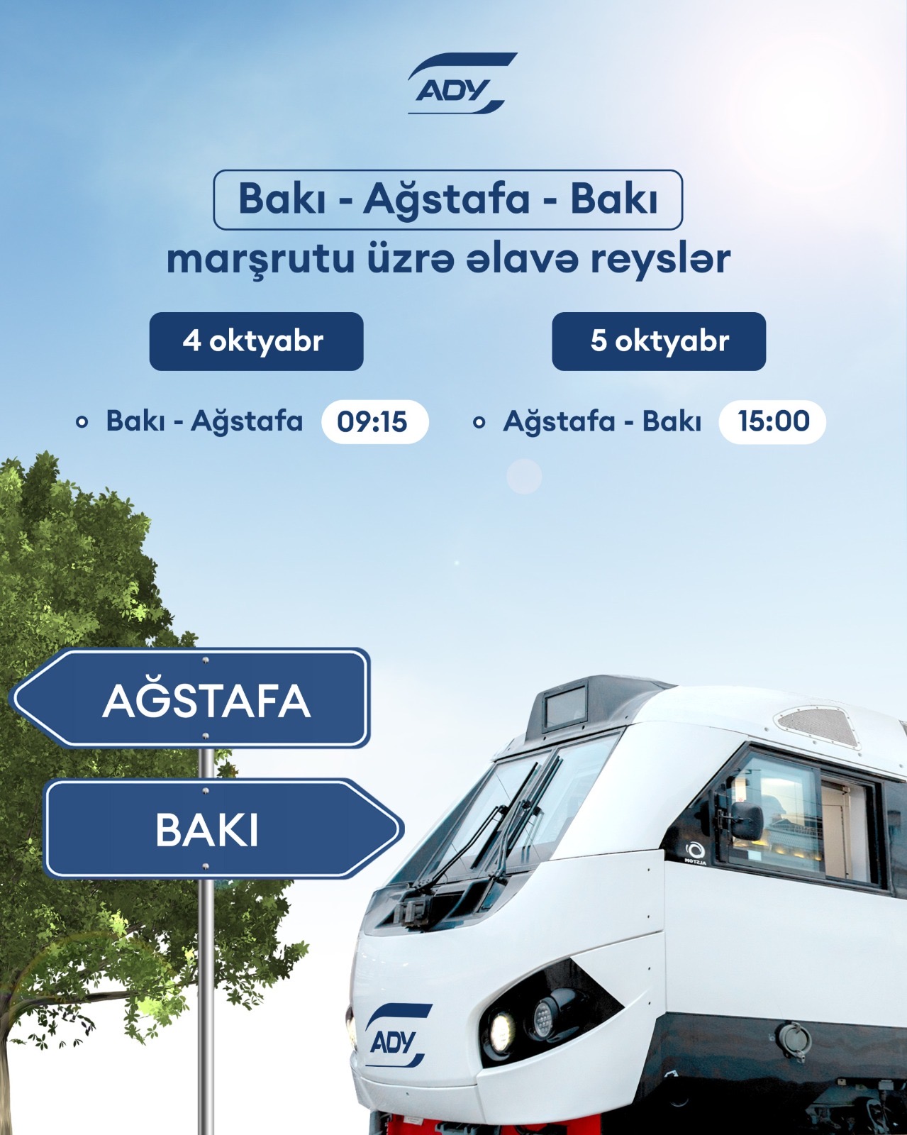 "Azərbaycan Dəmir Yolları" QSC (ADY) artan sərnişin tələbatını qarşılamaq üçün oktyabrın 4-5-də Bakı-Ağstafa-Bakı istiqamətində əlavə qatar reysləri həyata keçirəcək.