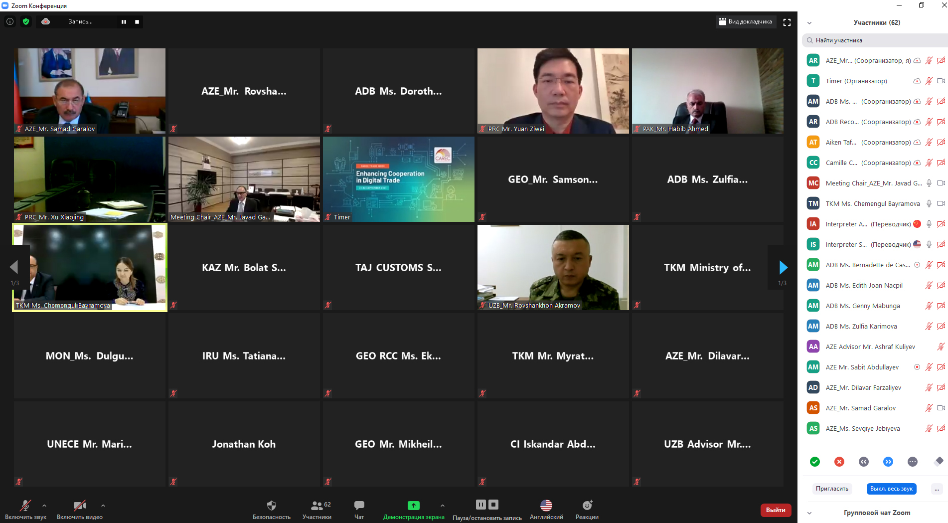 Tədbirdə CAREC üzv ölkələrinin nümayəndələri tərəfindən (Azərbaycan, Çin Xalq Respublikası, Gürcüstan, Monqolustan, Pakistan, Türkmənistan, Tacikistan, Özbəkistan, Qazaxıstan) gömrük sistemlərində həyata keçirilən yeniliklər, səlahiyyətli iqtisadi operator səlahiyyətlərinin genişləndirilməsi, elektron “Bir pəncərə” sisteminin tətbiqi, gömrük nəzarəti və gömrük rəsmiləşdirilməsi sahəsində tətbiq edilən rəqəmsal layihələr barədə ətraflı məlumatlar iclas iştirakçılarının diqqətinə çatdırılıb.