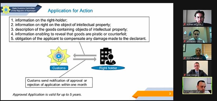 Ümumdünya Gömrük Təşkilatının Bakıda yerləşən Potensialın Gücləndirilməsi üzrə Avropa Regional Ofisində "Əqli Mülkiyyət Hüquqları: Biliklərin Təkmilləşdirilməsi və Təcrübələrin Paylaşılması" mövzusunda vebinar keçirilib.