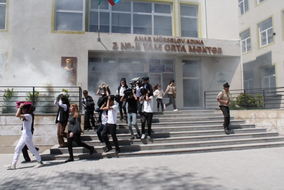 Praktiki hissədə isə baş vermiş şərti fövqəladə hadisə ilə əlaqədar məktəb kollektivinin təxliyəsi, “zərərçəkmişlərə ilkin yardımın göstərilməsi” və digər əməliyyatlar icra olunub.