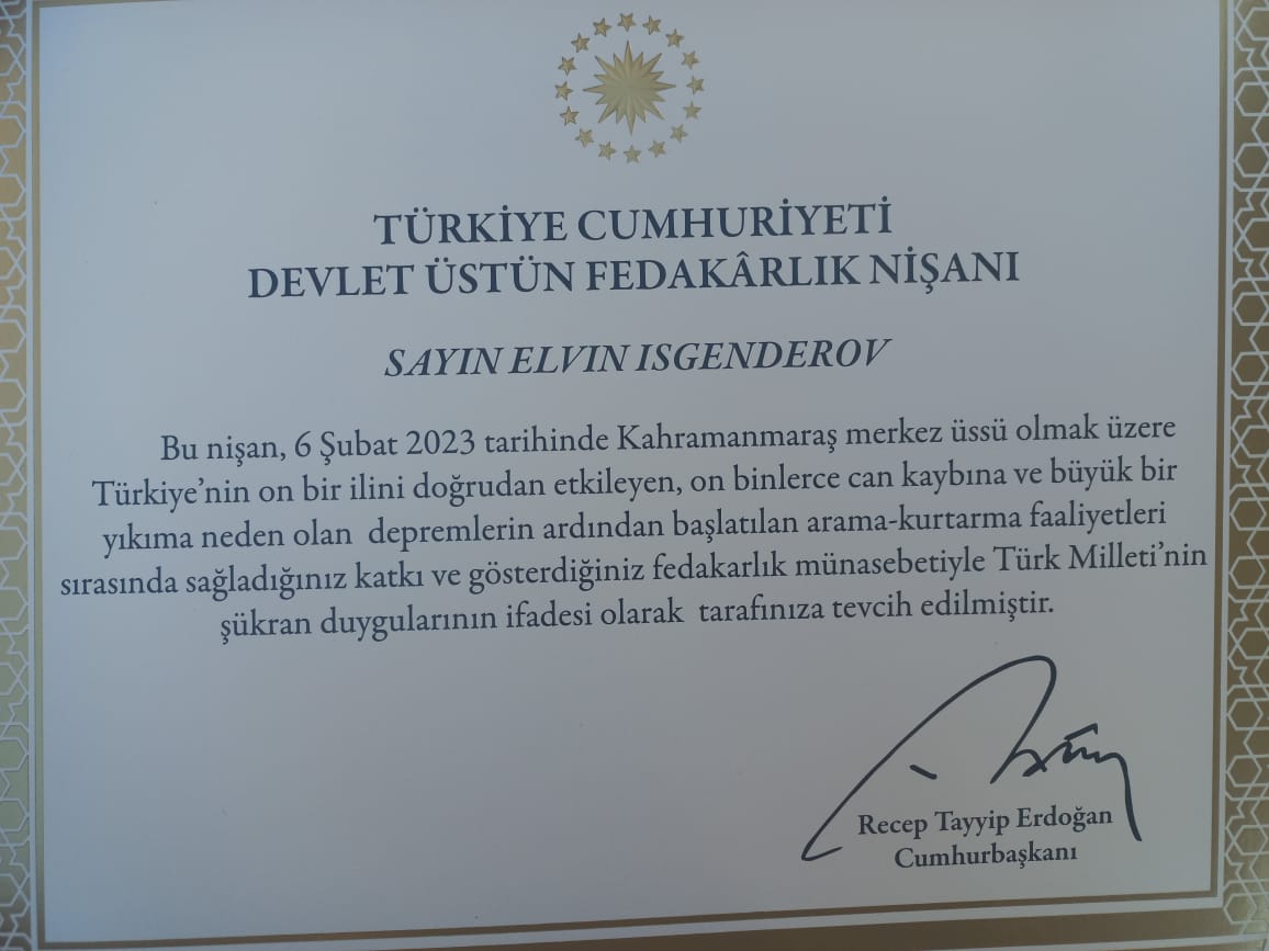 Qardaş ölkədə axtarış-xilasetmə əməliyyatlarında iştirak edən Fövqəladə Hallar Nazirliyi Xüsusi Riskli Xilasetmə Xidmətinin xilasedicisi gizir İsgəndərov Elvin Xaqani oğlu “Türkiyə Cümhuriyyəti Dövlət Üstün Fədakarlıq Medalı” ilə təltif olunub.