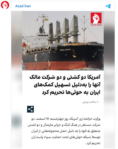 ABŞ Maliyyə Nazirliyi İslam İnqilabı Keşikçiləri Korpusunun (SEPAH) dəstəklədiyi husilərə İrandan yük daşıdığına görə Honkonq və Marşall adalarında yerləşən iki şirkətə və onlara məxsus iki gəmiyə sanksiya tətbiq edib.