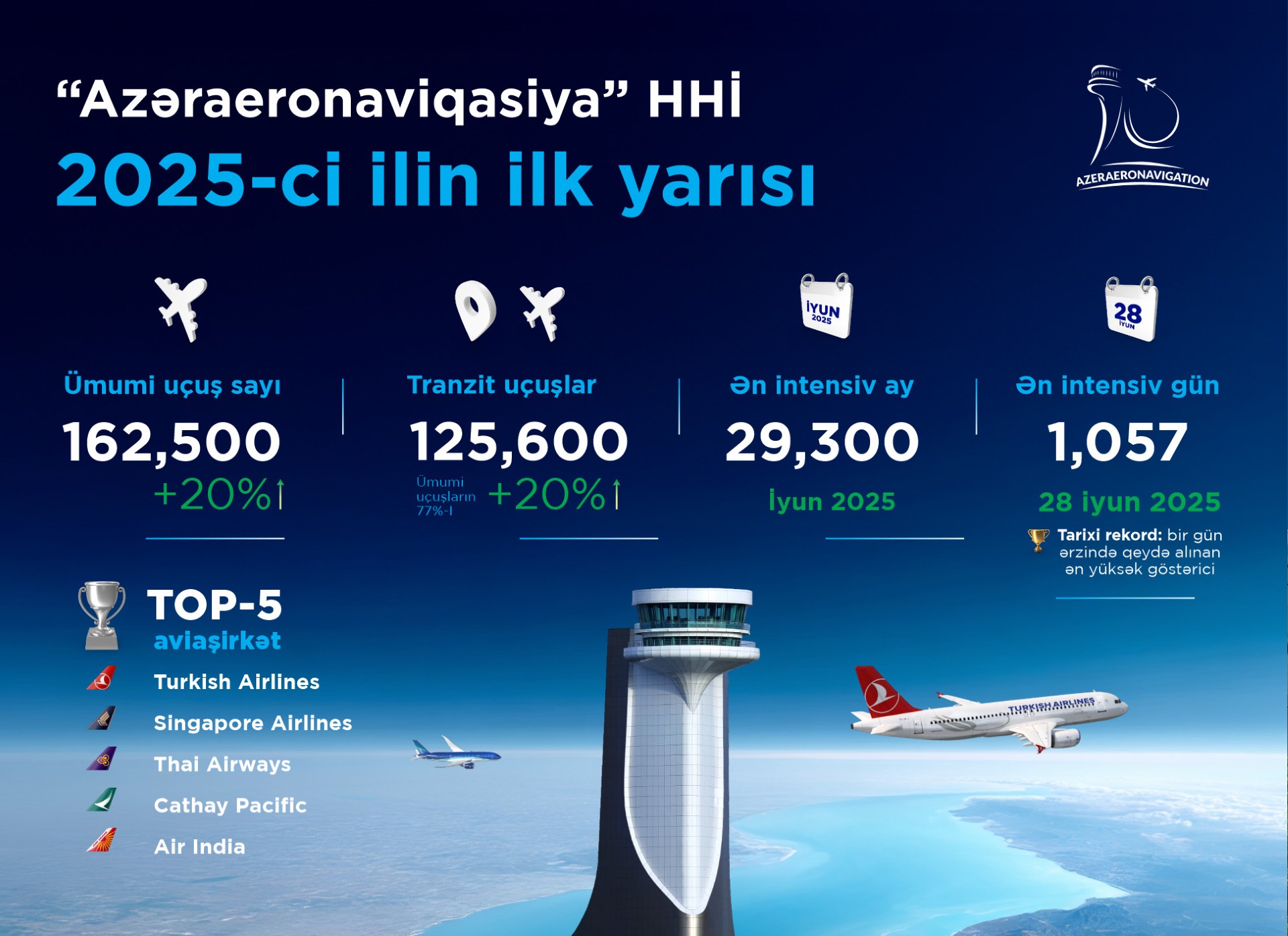2025-ci ilin yanvar–iyun aylarında “Azəraeronaviqasiya” Hava Hərəkəti İdarəsi tərəfindən Azərbaycanın hava məkanında, ümumilikdə, 162 min 500-dən çox aviareysə xidmət göstərilib ki, bu da ötən ilin müvafiq dövrü ilə müqayisədə 20 faizlik artım deməkdir. 2024-cü ilin ilk yarısında bu göstərici 135 min 500 təşkil etmişdi.