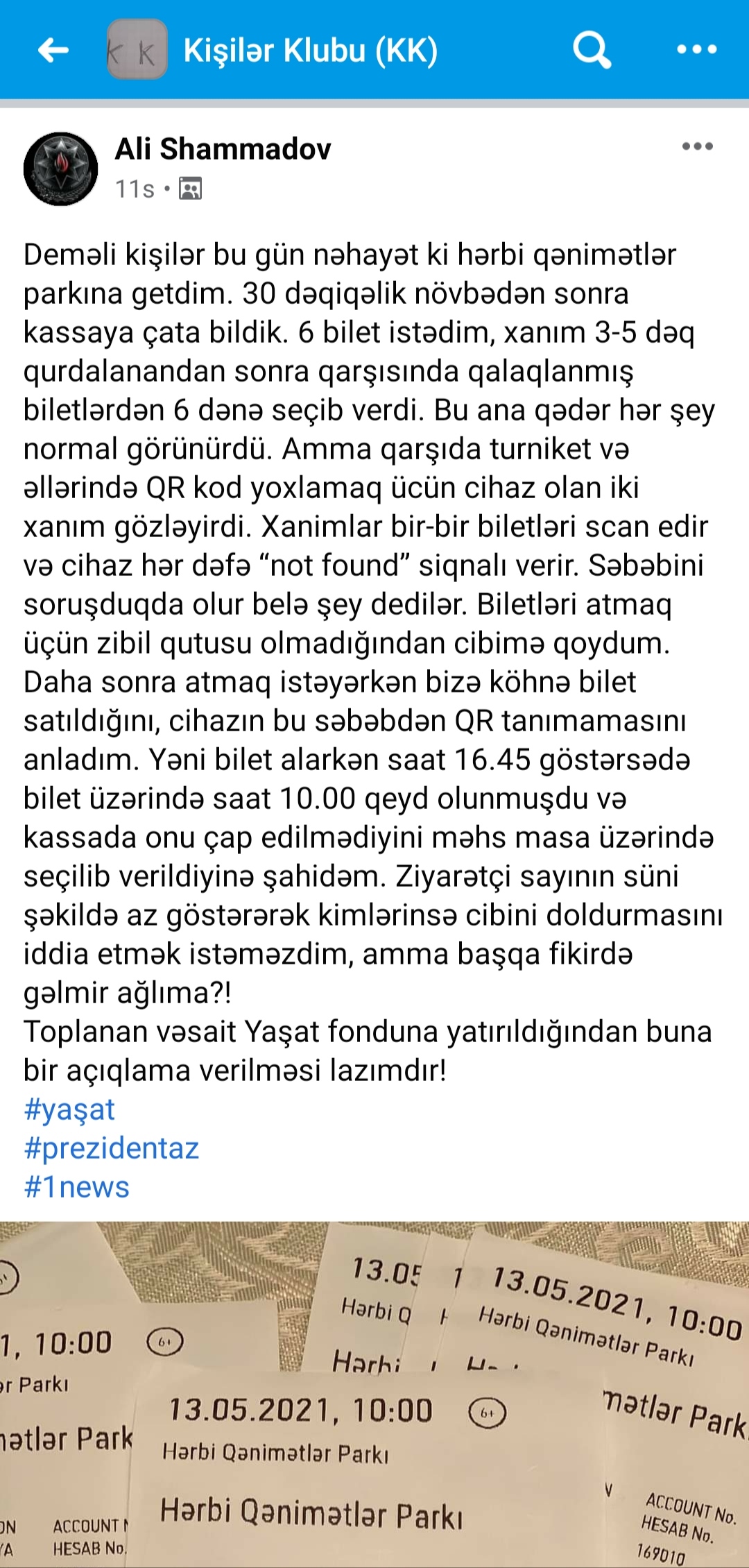 "Qarşıda turniket və əllərində QR kod yoxlamaq ücün cihaz olan iki xanım gözləyirdi. Xanımlar bir-bir biletləri scan edir və cihaz hər dəfə “not found” (tapılmadı) siqnalı verir. Səbəbini soruşduqda, "belə şeylər olur"- dedilər. Biletləri atmaq üçün zibil qutusu olmadığından cibimə qoydum. Daha sonra atmaq istəyərkən bizə köhnə bilet satıldığını və cihazın bu səbəbdən QR kodu tanımamasını anladım. Yəni bilet alarkən saat 16:45-i göstərsə də, bilet üzərində saat 10:00 qeyd olunub. Kassada saata uyğun biletin çap edilmədiyini və məhz masa üzərində seçilib verildiyinə şahidəm.