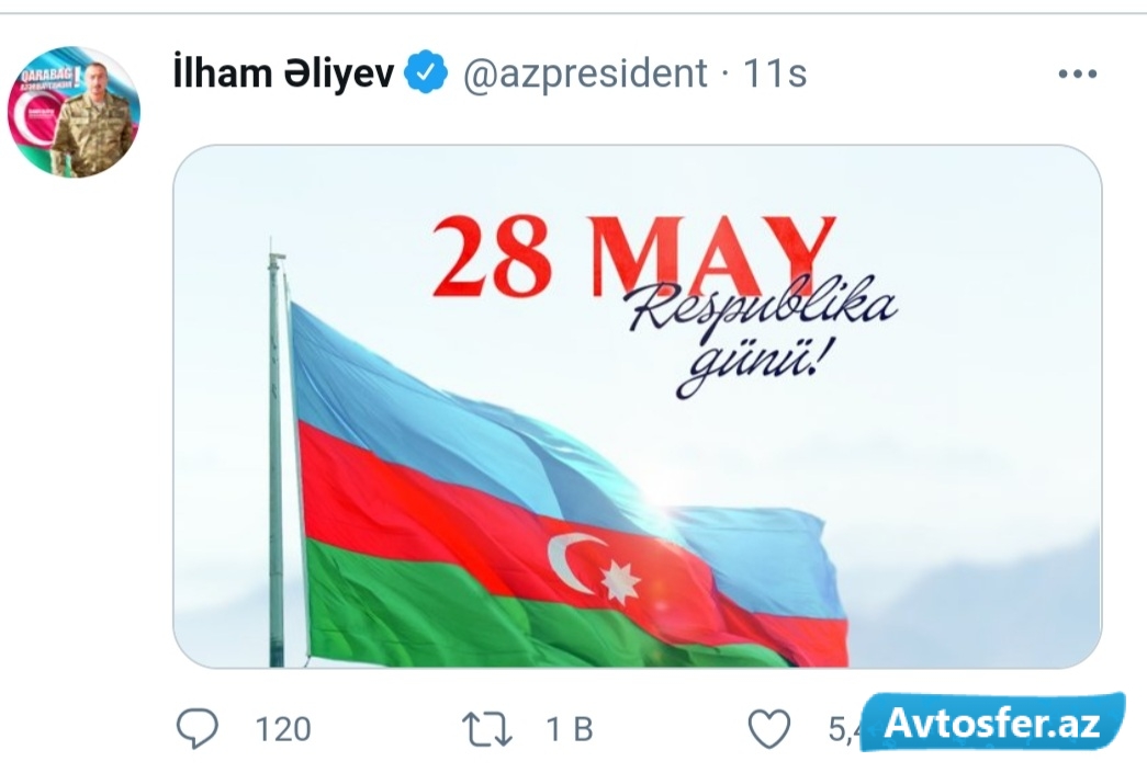 Azərbaycan Respublikasının Prezidenti İlham Əliyev özünün tvitterdəki hesabında 28 May - Respublika Günü ilə bağlı paylaşım edib.