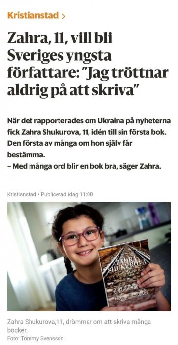 Avtosfer.az xəbər verir ki, “Fredenes Följare” (Sülh təqibçiləri) adlanan kitab Ukrayna müharibəsində qaçqın düşən bacı-qardaşdan bəhs edir. Müəllif kitabda əvvəlcə Polşaya, oradan isə İsveçə köçən uşaqların həyatını hekayəyə çevirib. Müəllif diqqəti həm uşaqların sülh istəmələrinə, həm də onların İsveçdə hüzur, firavan həyat tapmalarına çəkib. Kitab İsveç mətbuatında da marağa səbəb olub. Belə ki, müəllif kitabı haqqında İsveçin nüfuzlu media orqanlarına müsahibə verib. Müsahibədə Zəhranın cəmi 4 ildir İsveçdə yaşamasına baxmayaraq, yerli dili səlis bilməsi və bu dildə kitab yazmasına diqqət çəkilib.