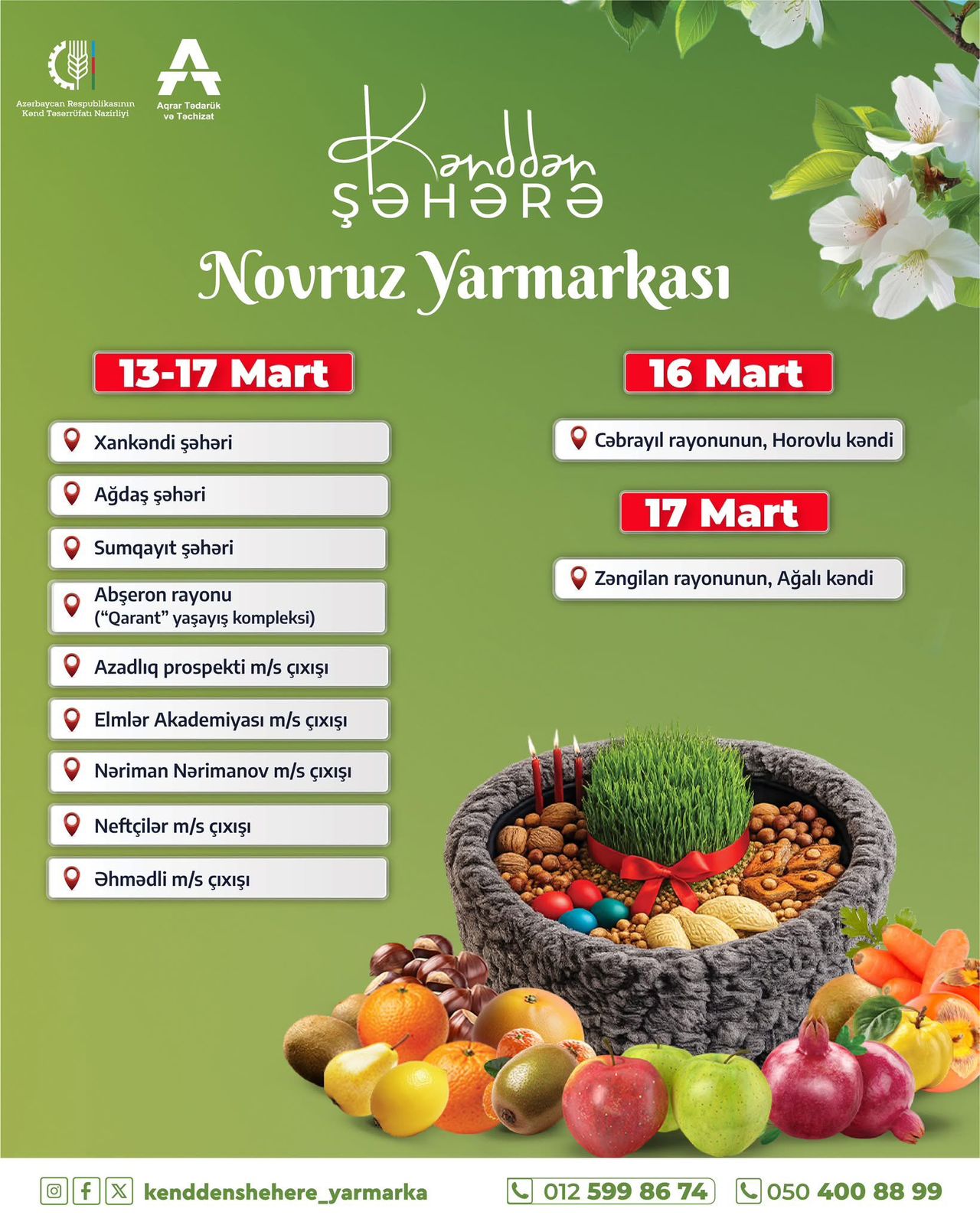 Belə ki, 13–17 mart tarixlərində paytaxtın müxtəlif ərazilərində – Əhmədli, Neftçilər, Nəriman Nərimanov, Azadlıq prospekti və Elmlər Akademiyası metrostansiyalarının çıxış hissələrində, eyni zamanda, regionlarda- Sumqayıt şəhəri (Kimyaçı mədəniyyət sarayının qarşısı), Xankəndi şəhəri (Tələbə şəhərciyinin yanı), Ağdaş şəhəri Heydər Əliyev prospekti 541 və Abşeron rayonunun Mehdiabad qəsəbəsində "Qarant" yaşayış kompleksi ərazisində Novruz bayramı yarmarkaları fəaliyyət göstərəcək.