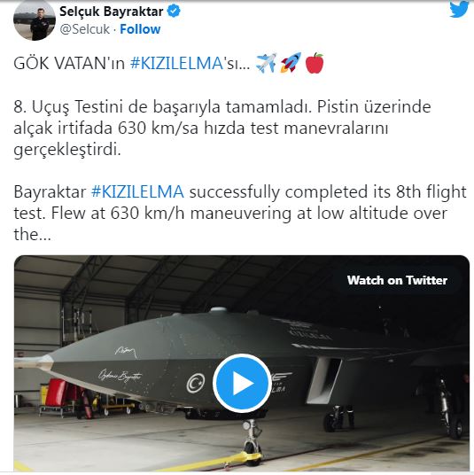 “Bayraktar Kızılelma 8-ci uçuş sınağını uğurla başa vurub. O, uçuş-enmə zolağında aşağı hündürlükdə 630 km/saat sürətlə sınaq manevrlərini həyata keçirib”, - şirkət başçısı qeyd edib.
