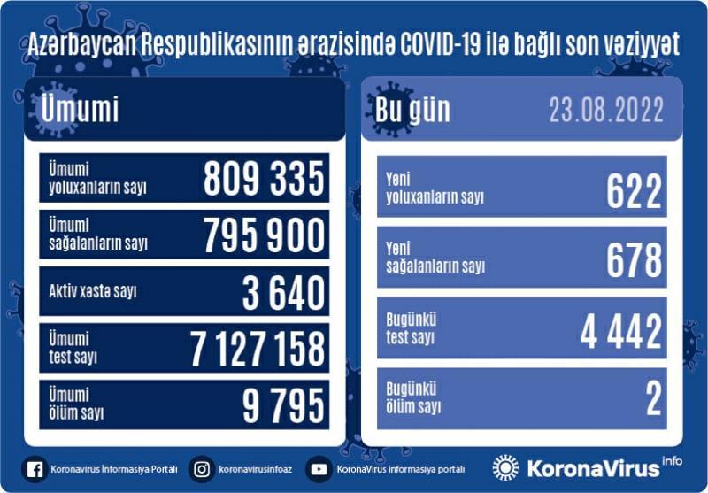 Azərbaycanda koronavirus (COVID-19) infeksiyasına 622 yeni yoluxma faktı qeydə alınıb, 678 nəfər müalicə olunaraq sağalıb.