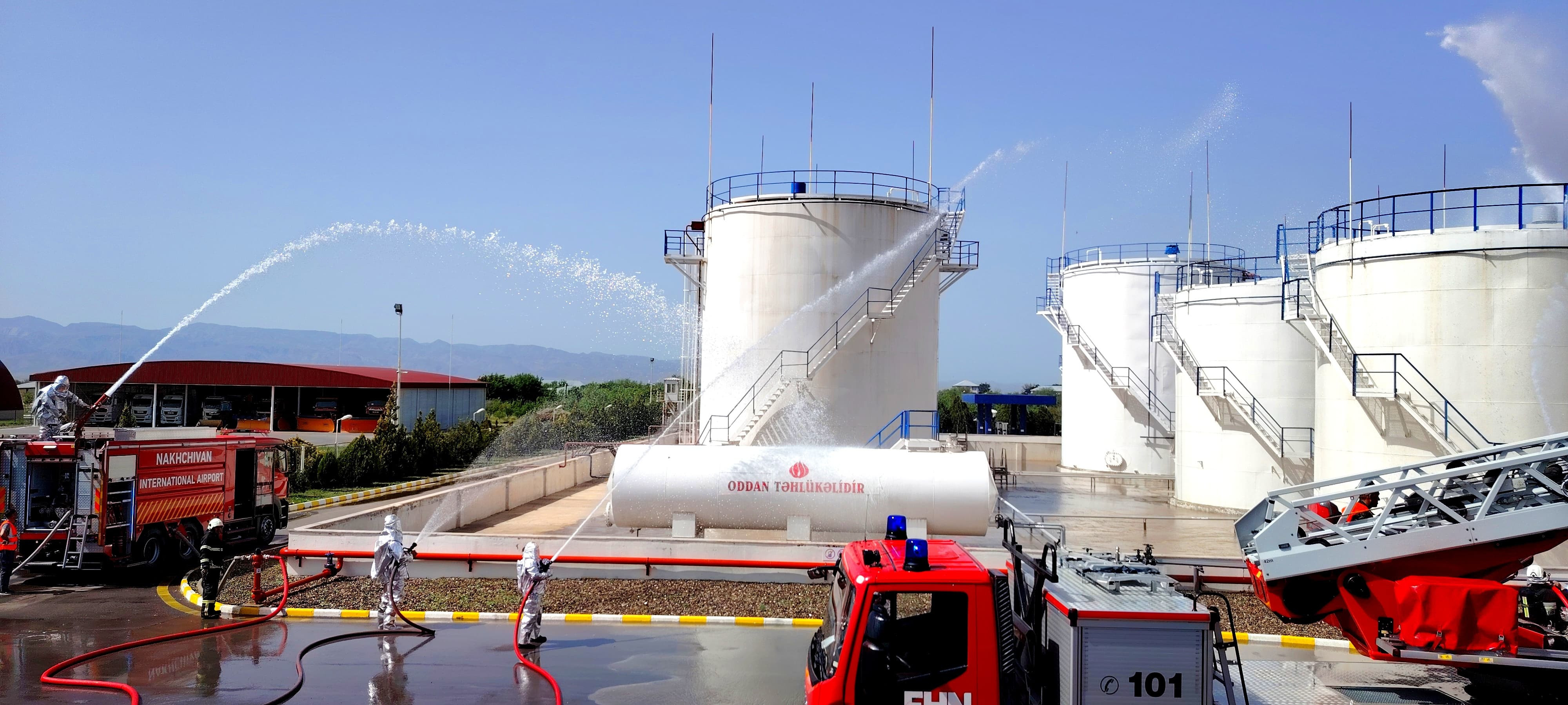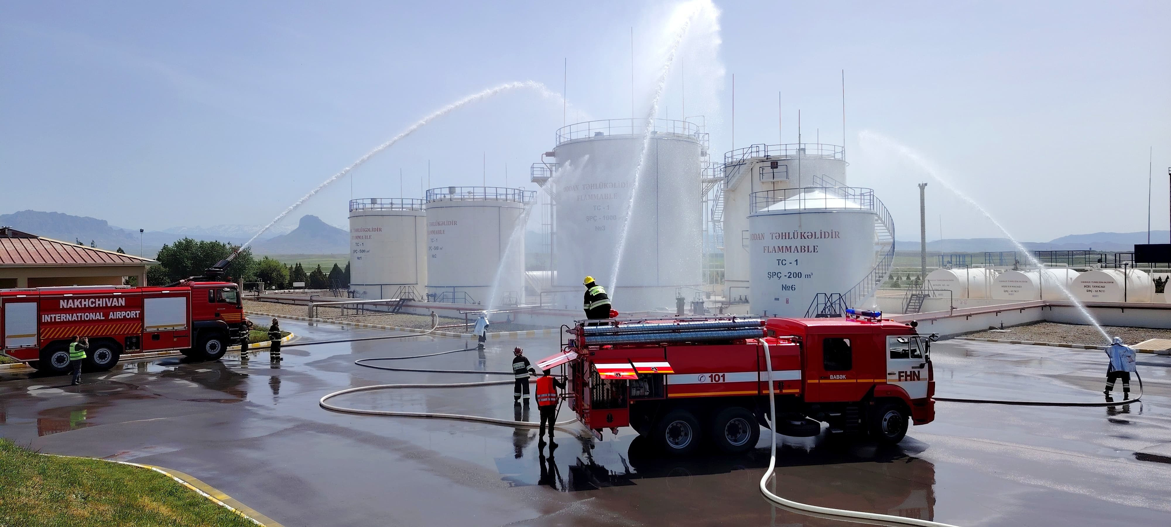 Naxçıvan Beynəlxalq Hava Limanı və Fövqəladə Hallar Nazirliyinin yanğınsöndürmə texnikası və şəxsi heyəti tərəfindən şərti yanğının qarşısı vaxtında alınıb, yanğının qonşu çənlərə keçməməsi üçün çənlərin soyudulması təmin edilib. Yanğın ocağında xəsarət alanlara hava limanın səhiyyə məntəqəsi tərəfindən ilk tibbi yardım göstərilib və onların xəstəxanaya təxliyəsi təmin olunub.