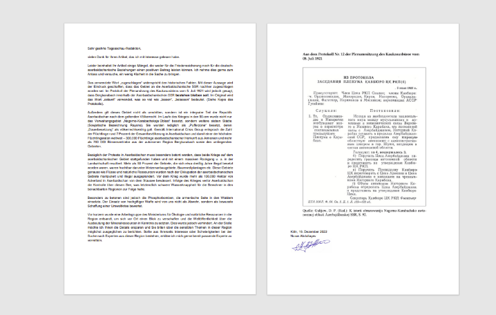 Redaktorlara ünvanlanan məktubda 16 dekabr tarixində yayımlanan "Laçın dəhlizində yeni gərginlik" sərlövhəli məqalədə buraxılmış ciddi siyasi və önəmli tarixi səhvlərə diqqət cəlb edilib.