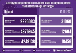 Ölkədə vurulan vaksinlərin ümumi sayı 9 226 083, birinci mərhələ üzrə vaksinasiya olunanların ümumi sayı 4 976 945, ikinci mərhələ üzrə vaksinasiya olunanların sayı isə 4 249 138 təşkil edir.