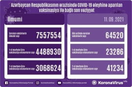 Ölkədə vurulan vaksinlərin ümumi sayı 7 557 554, birinci mərhələ üzrə vaksinasiya olunanların ümumi sayı 4 488 930, ikinci mərhələ üzrə vaksinasiya olunanların sayı isə 3 068 624 təşkil edir.