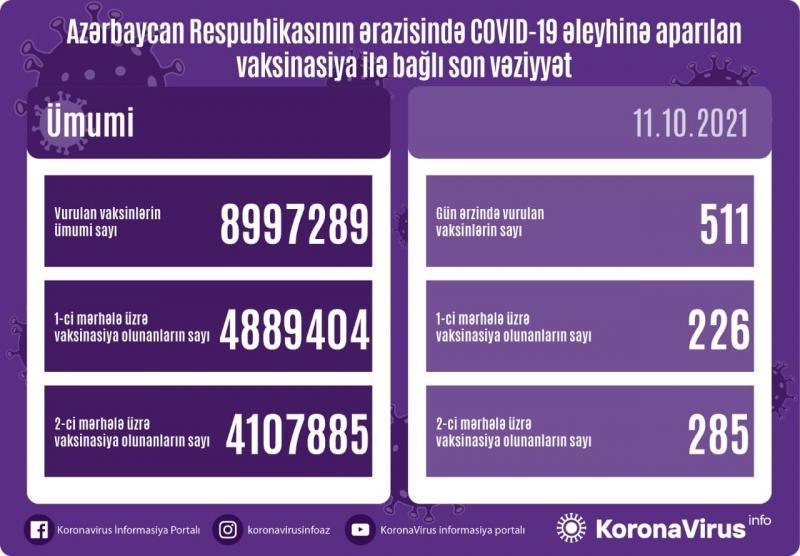Azərbaycanda son sutkada koronavirus (COVID-19) əleyhinə 511 vaksin vurulub.