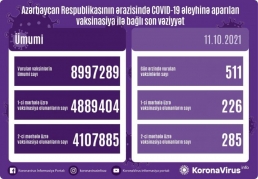 Ölkədə vurulan vaksinlərin ümumi sayı 8 997 289, birinci mərhələ üzrə vaksinasiya olunanların ümumi sayı 4 889 404, ikinci mərhələ üzrə vaksinasiya olunanların sayı isə 4 107 885 təşkil edir.