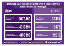 Ölkədə vurulan vaksinlərin ümumi sayı 9 073 493, birinci mərhələ üzrə vaksinasiya olunanların ümumi sayı 4 916 894, ikinci mərhələ üzrə vaksinasiya olunanların sayı isə 4 156 599 təşkil edir.