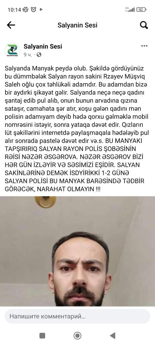 Sosial şəbəkələrdə Salyan rayonunda bir nəfər şəxsin qadınlara qarşı əxlaqsız hərəkətlər etdiyi, hədə-qorxu gəlməsi və şantaj yolu ilə onlarla məcburi tanış olması ilə bağlı məlumatlar paylaşılıb.