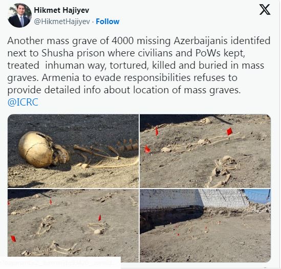 “Mülki şəxslərin və hərbi əsirlərin saxlandığı, qeyri-insani rəftara və işgəncələrə məruz qaldığı, öldürüldüyü və kütləvi məzarlıqlarda basdırıldığı Şuşa həbsxanası yaxınlığında 4 000 nəfər itkin düşmüş azərbaycanlının daha bir kütləvi məzarlığı müəyyən edilib”, - deyə paylaşımda qeyd olunub.