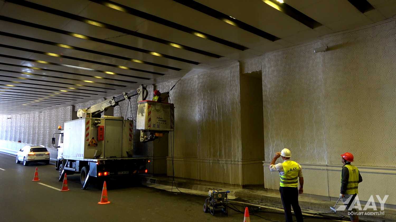 Sözügedən işlər zamanı tunellərin giriş-çıxışları, məhəccərlər, yan divarları, tuneldaxili yol nişanları, işıq əksetdiricilər, əyrixətli dəmir tirlər və bardür hissələri xüsusi təyinatlı maşınlar və xüsusi təmizləyici məhlullar vasitəsi ilə təzyiqli su verilərək yuyulur.