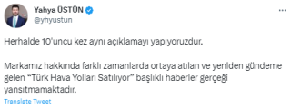 Türk Hava Yollarında (THY) mətbuat üzrə müşavir Yəhya Üstün şirkətin Qətərə satılması ilə bağlı məsələyə aydınlıq gətirib.