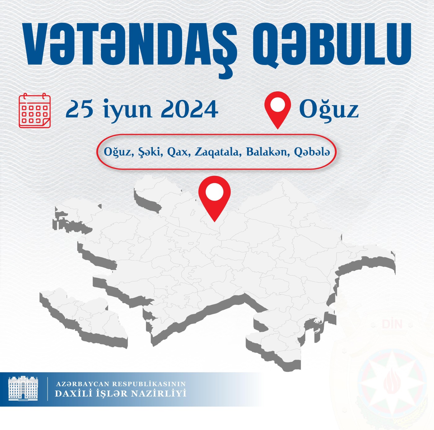 Azərbaycan Respublikasının daxili işlər naziri general-polkovnik cənab Vilayət Eyvazov tərəfindən 2024-cü il iyun ayının 25-də Oğuz Rayon Polis Şöbəsinin inzibati binasında Oğuz, Şəki, Qax, Zaqatala, Balakən, Qəbələ şəhər və rayonlarının sakinlərinin qəbulu keçiriləcək.