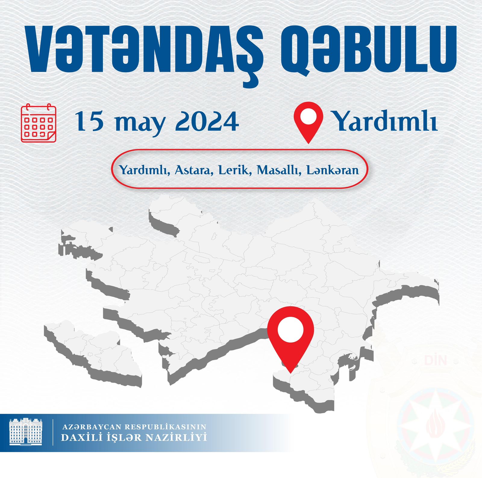 Azərbaycan Respublikasının daxili işlər naziri, general-polkovnik Vilayət Eyvazov tərəfindən 2024-cü il may ayının 15-də Yardımlı Rayon Polis Şöbəsinin inzibati binasında Yardımlı, Astara, Lerik, Masallı və Lənkəran şəhər və rayonlarının sakinlərinin qəbulu keçiriləcək.