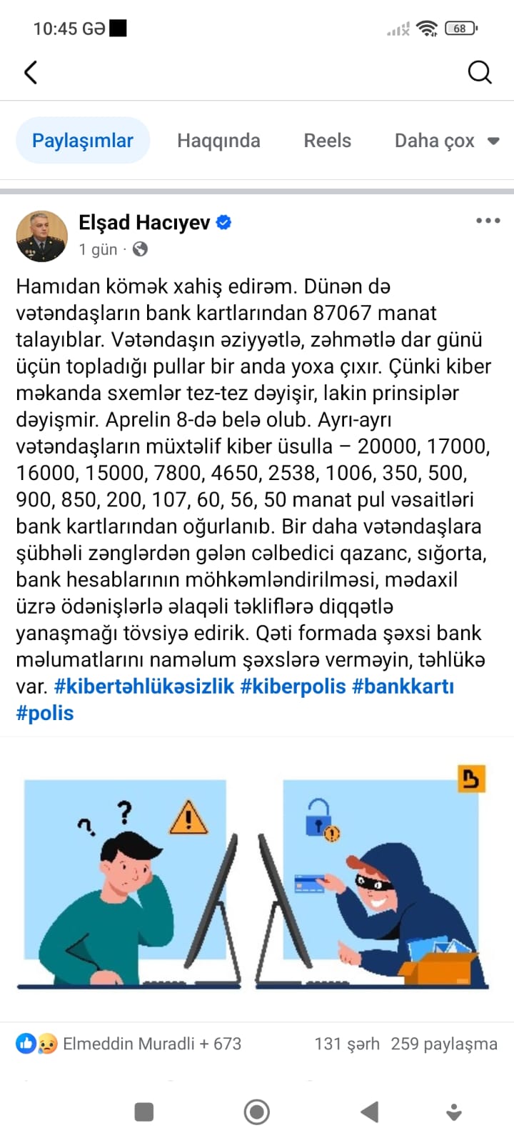 “Dünən də vətəndaşların bank kartlarından 87067 manat talayıblar. Vətəndaşın əziyyətlə, zəhmətlə dar günü üçün topladığı pullar bir anda yoxa çıxır. Çünki kiber məkanda sxemlər tez-tez dəyişir, lakin prinsiplər dəyişmir,” – deyə Elşad Hacıyev bildirib.