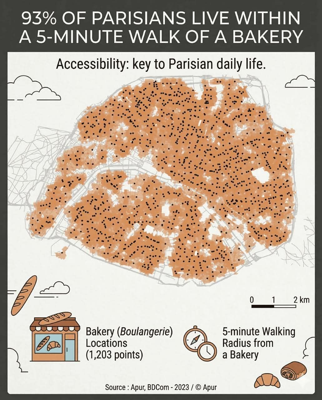 Avtosfer.az xəbər verir ki, ekspert Fransanın paytaxtı Parisdə aparılan araşdırmaya əsasən, şəhər sakinlərinin 93 faizinin cəmi 5 dəqiqəlik piyada məsafəsində çörəkxanaya – “boulangerie”yə çata bildiyini diqqətə çatdırıb. Qeyd olunub ki, şəhərdə 1200-dən çox çörəkxana fəaliyyət göstərir və onların yerləşmə şəbəkəsi demək olar ki, bütün ərazini əhatə edir.