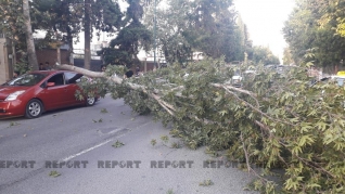 Kürdəmir şəhərində iri gövdəli ağac avtomobilin üzərinə aşıb.