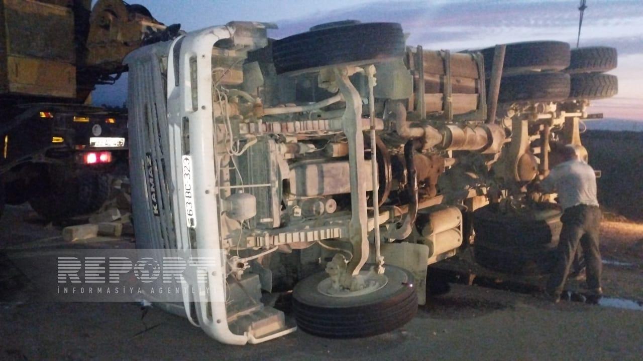 Mişar daşı ilə dolu olan yük maşını qəfil idarəetmədən çıxıb. Nəticədə nəqliyyat vasitəsi aşıb və mişar daşları yola tökülüb.