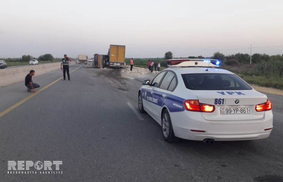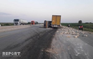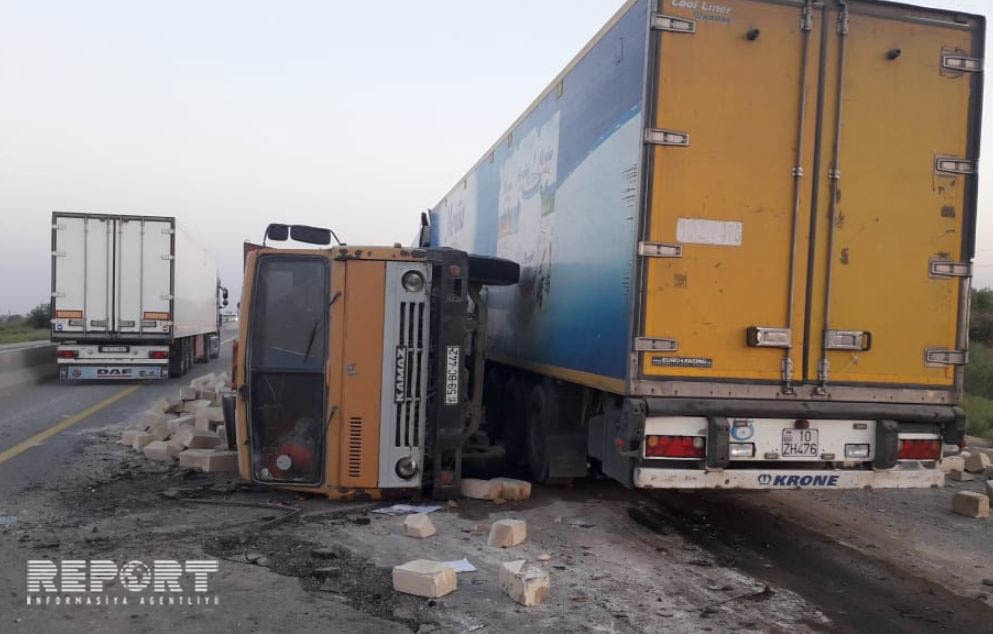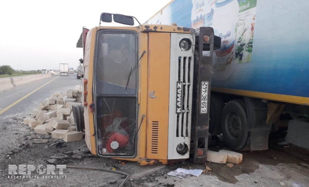 Kürdəmirdə yük maşını "Kamaz"a çırpılaraq onu aşırıb - FOTO