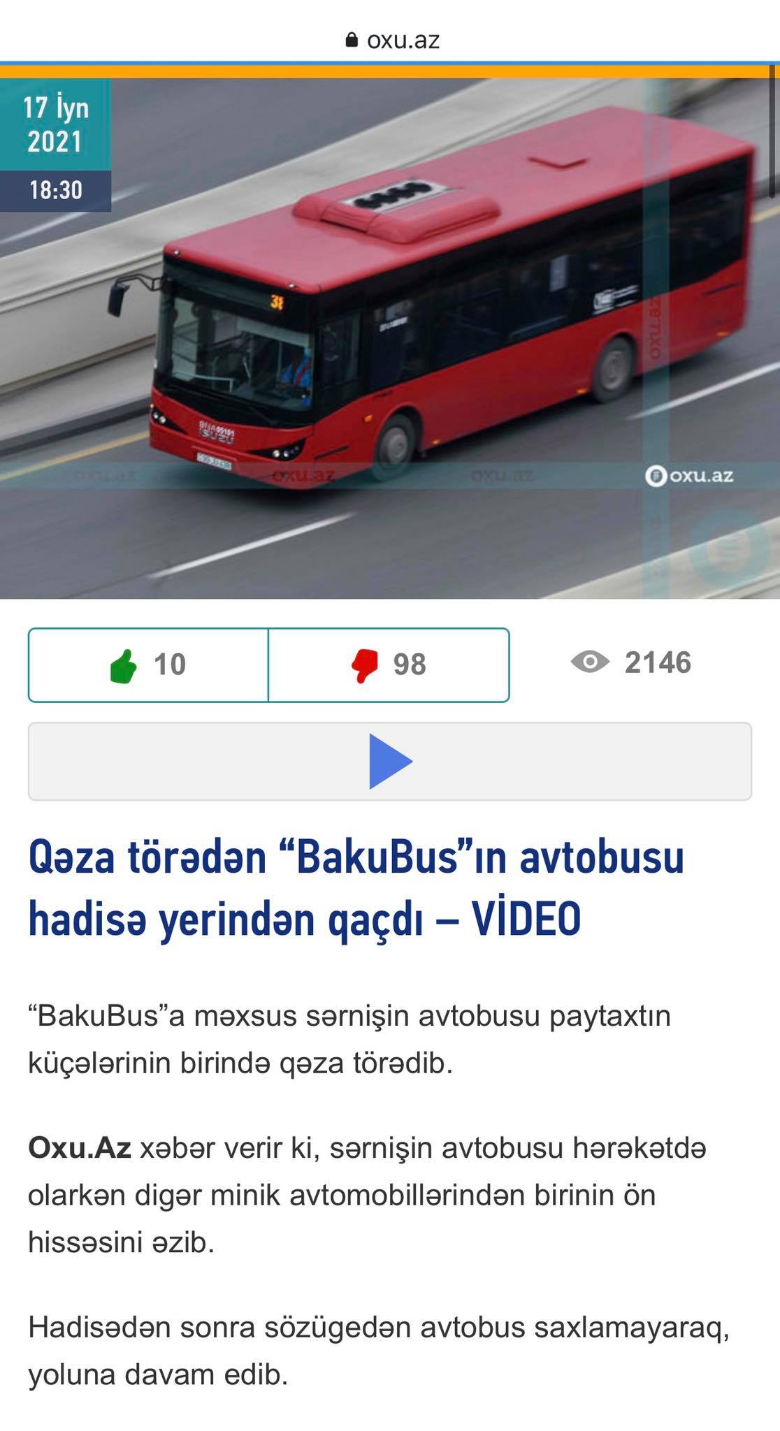 Bəzi KİV-də “BakuBusa” qəza törədərək hadisə yerindən yayınması ilə bağlı yayılan məlumat həqiqəti əks etdirmir. Bu barədə Avtosfer.az-a "BakuBus MMC”dən məlumat verilib. Bildirilib ki, 17.06.2021 tarixində saat 11:20 radələrində İnşaatçılar prospüktində 3 nömrəli xətt üzrə Dövlət Qeydiyyat Nişanı 99 JU 864 avtobusun iştirakı ilə yüngül yol nəqliyyat hadisəsi baş verib. Hadisə yol ayrıcında baş verdiyindən avtobusun sürücücü hərəkətin təhlükəzliyi üçün bir qədər irəlidə saxlayaraq qəza barədə DYP-nə və sığorta şirkətinə məlumat verib. Qəza barədə Bakı Nəqliyyat Agentliyinin Mərkəzi Dispetçer Xidməti də məlumatlandırılıb. Həmçinin bildiririk ki, “BakuBus” avtobusları Bakı Nəqliyyat Agentliyinin Mərkəzi Dispetçer Xidmətinə inteqrasiya olunaraq daimi müşahidə altındadır. Hər bir avtobusda sürücü davranışları real vaxt rejimində izlənildiyindən qəza törədərək hadisə yerindən yayınma qeyri-mümkündür. Paytaxtımızda mötəbər idman tədbirinin keçirildiyi günlərdə bu kimi qeyri-real məlumatların yayılması heç də təsadüfi deyil. Məqsəd beynəlxalq tədbirlər zamanı uğurla icra edilən nəqliyyat tədbirlərini gözdən salmaqdır. Bir daha bəzi media təmsilçilərini peşə etikasına və peşəkarlıq prinsiplərini əməl edərək əldə edilən məlumatı rəsmi mənbələrdən təsdiq etməyə çağırırıq. Yayılan hər bir yalnış informasiya cəmiyyətdə narahatlıq və çaşqınlıq yaratmaqla yanaşı məlumatı yayan informasiya orqanının obyektivliyini də şübhə altına alır.