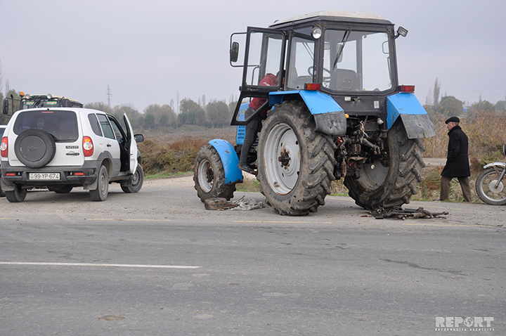 Sabirabad rayonunda ağır yol-nəqliyyat hadisəsi baş verib. Avtosfer.az-ın “Report”aistinadən məlumatına görə, hadisə rayonun Şəhriyar kəndi ərazisində qeydə alınıb. Belə ki, həmin kəndin sakini, 1973-cü il təvəllüdlü Ramiz Abdullayevin idarə etdiyi traktor “Ford” markalı 30-AA -194 dövlət qeydiyyatlı avtomobillə toqquşub. Nəticədə traktor idarəetmədən çıxaraq aşıb. Hadisə zamanı traktorda olan sürcünün oğlu 2014-cü il təvəllüdlü Rasət Ramiz oğlu Abdullayev aldığı xəsarətlərdən yerindəcə ölüb. Traktorun sürücüsü isə ağır xəsarətlərlə Şirvan Şəhər Xəstəxanasına yerləşdirilib. Faktla bağlı araşdırma aparılır.