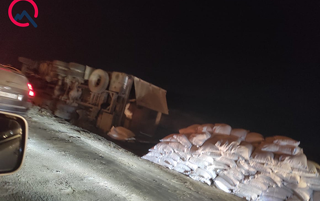 “Qafqazinfo” xəbər verir ki, hərəkətdə olan “KamAZ” markalı yük avtomobili yoldan çıxaraq aşıb və içərisindəki yük yola səpələnib. Qəzaya yük maşınının asfalt yoldakı tıxacdan qurtulmaq üçün torpaq yola çıxması səbəb olub.