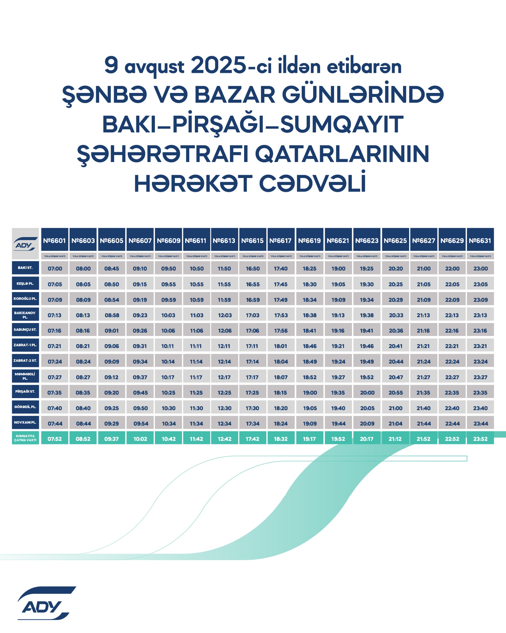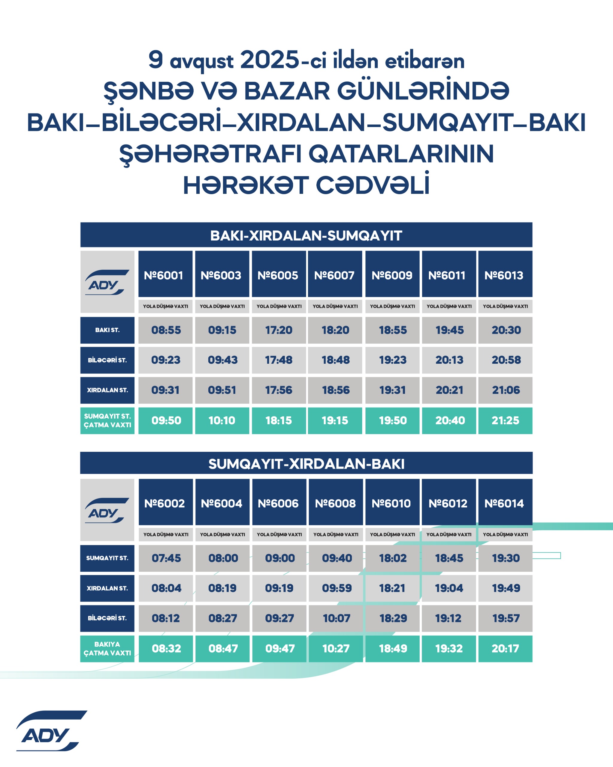 Bildirilib ki, yeni qrafikə əsasən Bakıdan və Sumqayıtdan qatarların hərəkət saatı aşağıdakı kimi təyin edilir: