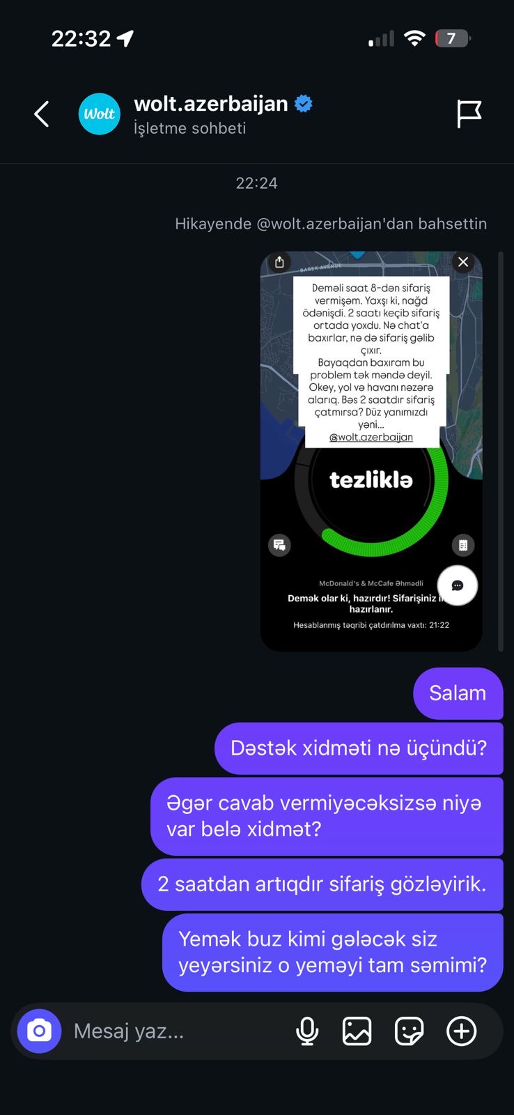 Onlayn çatdırılma xidmətlərindən istifadə gündəlik həyatımızın ayrılmaz hissəsinə çevrilsə də, bu sahədə yaşanan gecikmələr və məsuliyyətsizlik müştəri məmnuniyyətini ciddi şəkildə zədələyir. Xüsusilə vaxt amili önəmli olan sifarişlərdə baş verən laqeydlik istehlakçıların haqlı narazılığına səbəb olur. Bu cür hallardan biri də “Wolt” çatdırılma xidməti ilə bağlı Avtosfer.az-ın qaynar xəttinə daxil olan şikayətdə öz əksini tapıb.