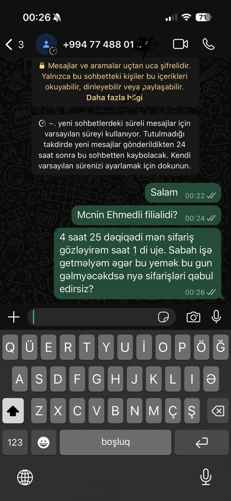Diqqət çəkən digər mühüm məqam isə sifarişin nağd ödənişlə verilməsidir. Müştəri haqlı olaraq sual edir: “Əgər bu sifariş kartla ödənilmiş olsaydı, vəsaitin geri qaytarılmasına görə məsuliyyəti kim daşıyacaqdı?” Bu sual çatdırılma xidmətlərinin müştəri qarşısında həm xidmət, həm də maliyyə məsuliyyətinin yetərincə şəffaf olmadığını göstərir.