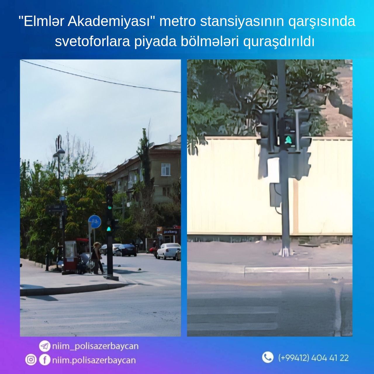 “Elmlər Akademiyası” metro stansiyasının qarşısında piyadaların təhlükə ilə üzləşdiyi kəsişmədə svetoforlara piyada bölmələri quraşdırılıb.