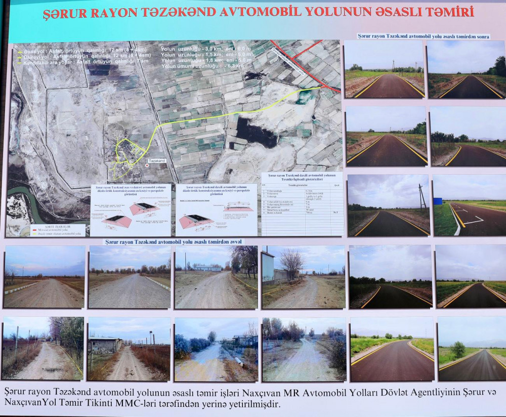 Şərur rayonunun Təzəkənd avtomobil yolu ilə tanışlıq zamanı isə bildirilib ki, yolda əsaslı təmir işləri “Naxçıvan Muxtar Respublikasının sosial-iqtisadi inkişafına dair 2023-2027-ci illər üçün Dövlət Proqramı” çərçivəsində aparılıb. Avtomobil yolunun 1,9 kilometrlik hissəsinə bir, 4,4 kilometrlik hissəsinə isə ikiqat asfalt örtüyü salınıb. Yağış və qrunt sularının kənarlaşdırılması üçün yol kənarlarına 700 m uzunluğunda beton su kanalı çəkilib, 38 metal boru su keçidi quraşdırılıb.