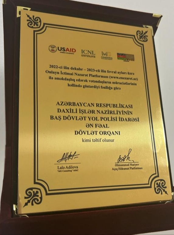 Baş Dövlət Yol Polisi İdarəsi Onlayn İctimai Nəzarət Platforması layihəsində fəallığına görə təltif edilib  - FOTO