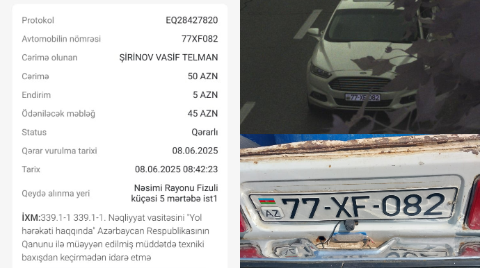 Nəticədə cərimə “Ford”a yox, bənzər nömrəyə, yəni 77-XF-082 qeydiyyat nişanlı “QAZ” markalı avtomobilin sürücüsünə göndərilib. Kameranın düzgün fiksasiya etməməsi səbəbindən “QAZ” sürücüsünə Nəsimi rayonun Fizuli küçəsində İXM-nin 339.1-ci maddəsini pozduğuna görə cərimə protokolu göndərilib. Sürücü bu vəziyyətdən xəbər tutduqda məsələni aidiyyəti quruma şikayət edib. Vətəndaş DYP-dən qaydaları pozmadığı halda tərtib edilən cərimə protokollarının ləğv edilməsini tələb edir.