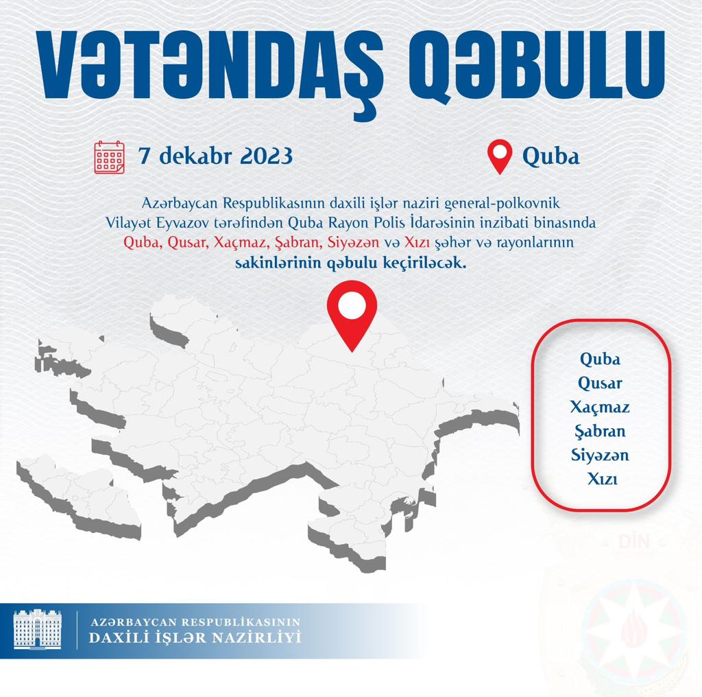 Daxili işlər naziri general-polkovnik Vilayət Eyvazov dekabrın 7-də Quba Rayon Polis İdarəsinin inzibati binasında Quba, Qusar, Xaçmaz, Şabran, Siyəzən və Xızı şəhər və rayonlarının sakinlərinin qəbulunu keçirəcək.