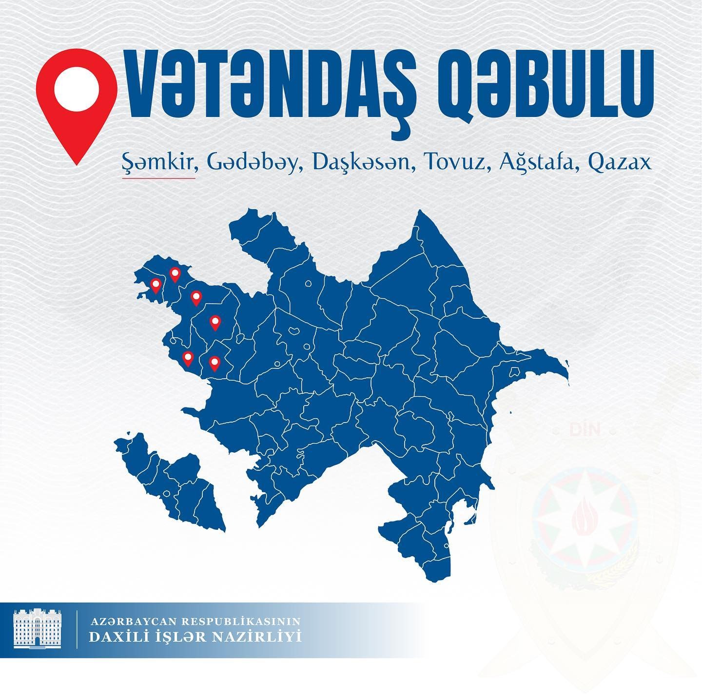 Daxili işlər naziri, general-polkovnik Vilayət Eyvazov tərəfindən mart ayının 16-da Şəmkir Rayon Polis Şöbəsinin inzibati binasında Gədəbəy, Daşkəsən, Tovuz, Ağstafa, Qazax və Şəmkir şəhər və rayonlarının sakinlərini qəbul edəcək.