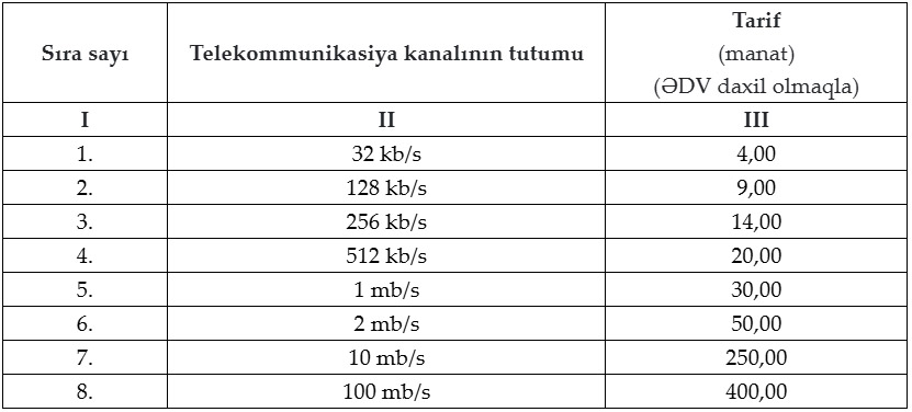 Согласно решению, тариф на подключение к каналам телекоммуникации внутри страны составляет 50 манатов с учетом НДС, независимо от пропускной способности канала.
